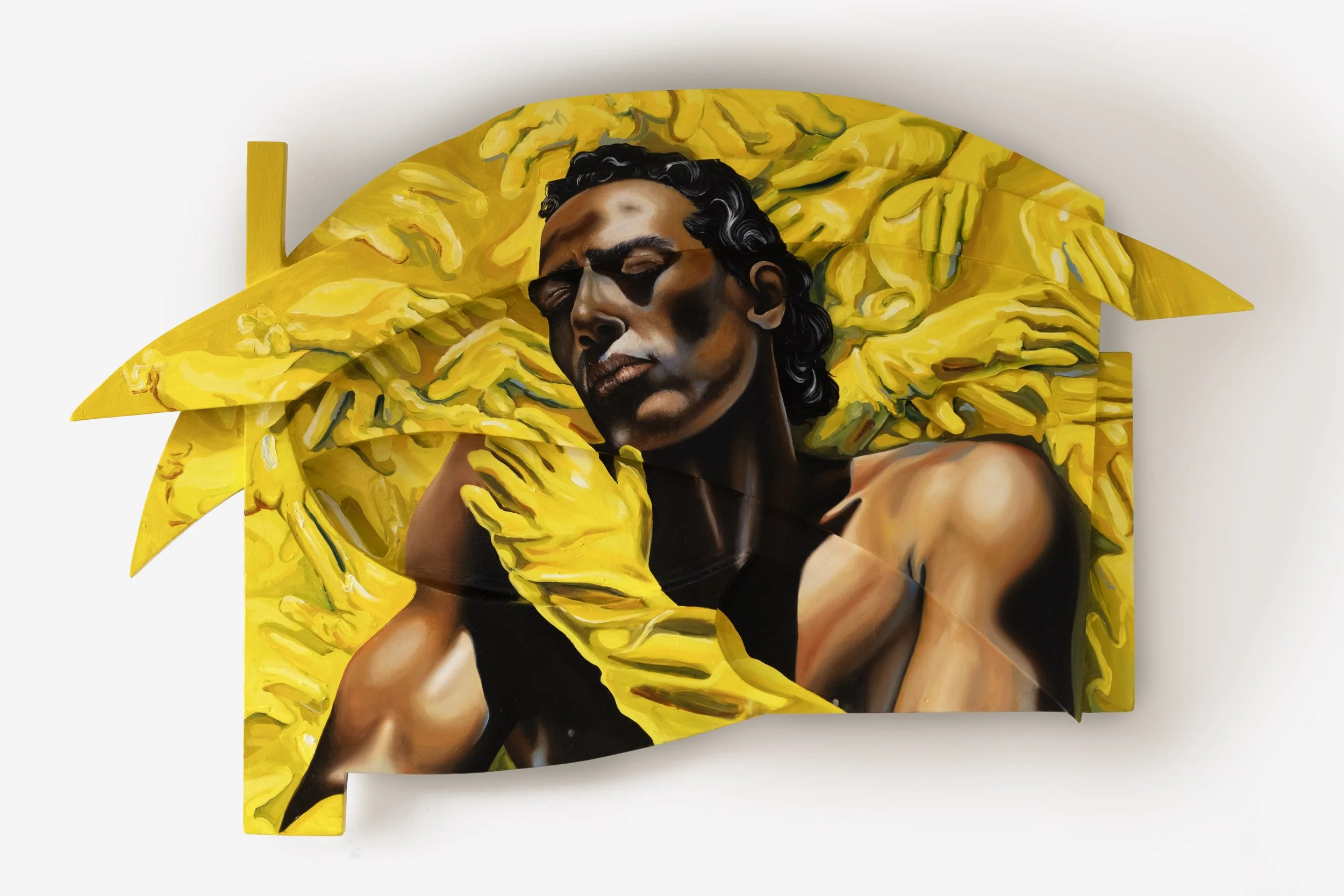 Each work is built on a sculptural, fragmented canvas that aligns into a coherent image only from one precise angle. From other perspectives, the image is disjointed, incomplete, or warped, mirroring how self-understanding is always partial and in flux.